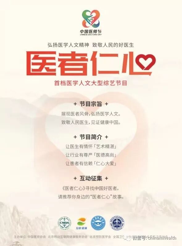 8月18日,为庆祝中华人民共和国成立70周年和第二个“中国医师节”暨第三届中国医学人文大会的召开,增强广大医师的荣誉感和使命感,进一步加强医学人文建设,推动卫生健康事业的可持续发展,由中国医师协会、北京移动互联网健康服务协会、北京预防医学会、全国卫生产业企业管理协会卫生法务分会主办、北京长江文化、海润传媒联合制作的大型医学人文电视艺节目《医者仁心》的启动仪式在2019年“中国医师节”庆祝大会上隆启动。