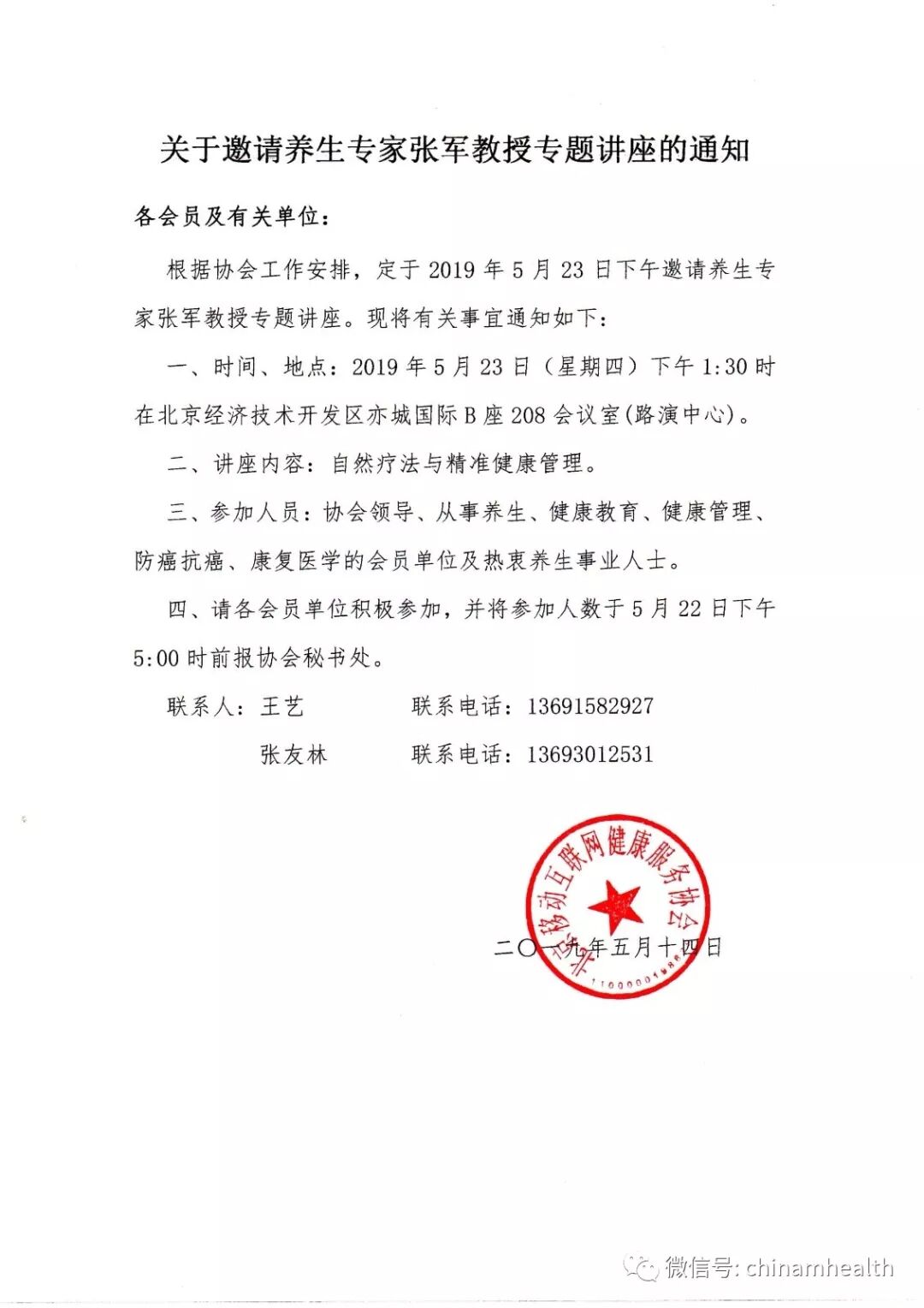 根据协会工作安排,定于2019年5月23日下午邀请养生专家张军教授专题讲座。现将有关事宜通知如下: